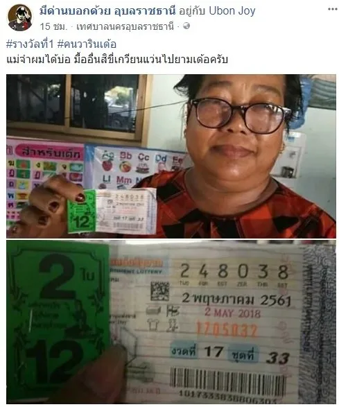 จ.อุบลราชธานี ในสังคมออนไลน์เพจ มีด่านบอกด้วย อุบลราชธานี ได้โพสท์ภาพผู้ถูกรางวัลที่ 1 ถึง 2 ใบ แม่ค้าผักสดตลาด อ.วารินชำราบ ผู้โชคดีคนนี้คือ นางรัด (นามสมมติ) อายุ 48 ปี แม่ค้าขายผักสดในตลาดวารินชำราบ โดยได้นำสลากกินแบ่งรัฐบาลไปลงประจำวันที่ สภ.วารินชำราบ เพื่อไว้เป็นหลักฐานขอรับเงินรางวัล
