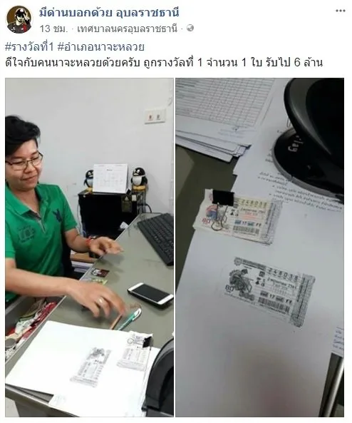 ขณะเดียวกัน ในเพจมีด่านบอกด้วยอุบลราชธานี ก็มีการโพสต์ภาพผู้โชคดีอีกคนใน อ.นาจะหลวย รับเงิน 6 ล้านบาท ซึ่งแหล่งข่าวอ้างว่าเป็นเจ้าหน้าที่ของเทศบาลตำบลภูจองนายอย