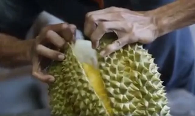 ทุเรียนที่สุกมาก ใช้มีดเจาะก้นผลแล้วบิดเปลือกออกจะทำให้แกะง่ายขึ้น
