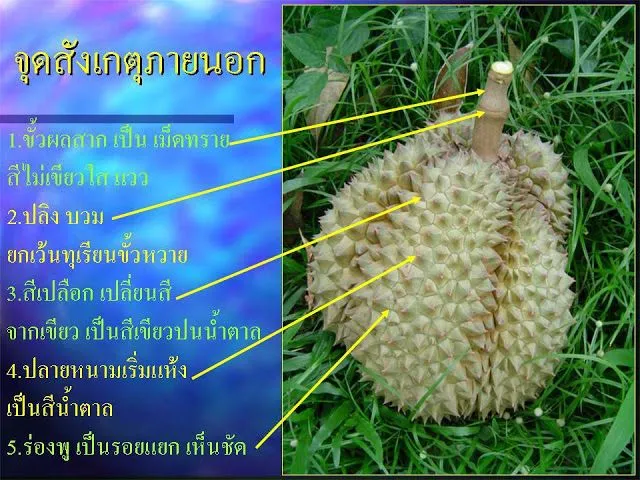 ดูหนาม ผลทุเรียนแก่ปลายหนามจะออกสีน้ำตาลเข้ม