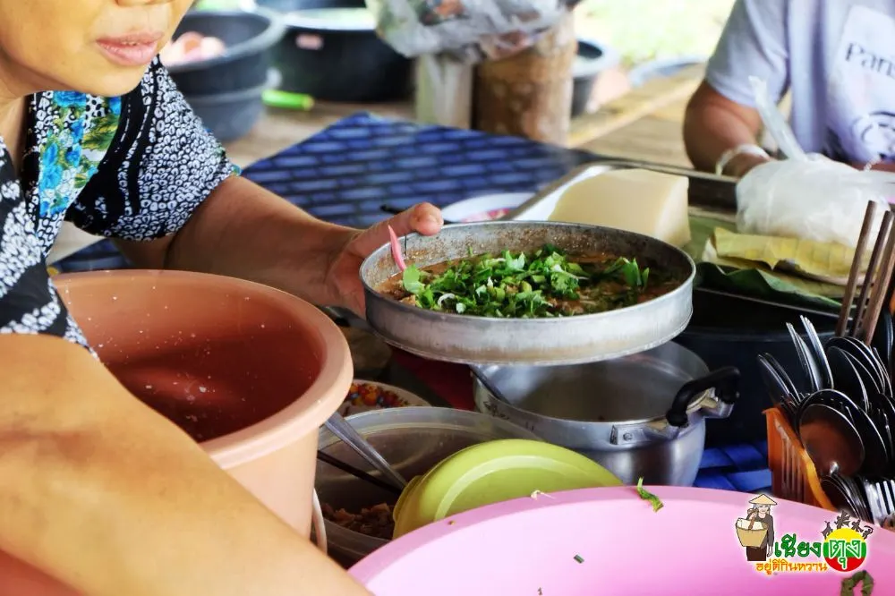 ข้าวซอยน้อย (ก๋วยเตี๋ยวลอยน้ำหรือพิซซ่าไทยใหญ่) ที่ปรุ่งด้วยเครื่องปรุงสารพัดอย่าง ไส่ไข่ หมู ปูอัด และผัก ลงในถาดไม่เล็กไม่ไหญ่มาก เอาไปลอยในน้ำเดือดปิดฝาไว้