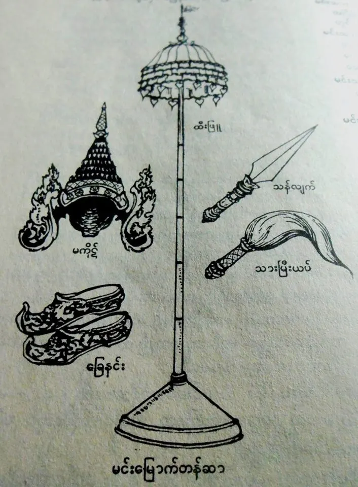 +++ ในคัมภีร์อัคคัญสูตร ได้กล่าวถึง "พระมหาสมติราช" อันเป็นบรรพกษัตริย์องค์แรกของโลก ที่มหาชนได้ร่วมกันถวายอำนาจ และยกยอพระองค์ขึ้นด้วยพิธีราชาภิเษกให้ทรงปกครองอาณาจักรและไพร่ฟ้าประชาชนด้วยความปกติสุขเป็นแบบอย่างแก่ชาวโลก ภายใต้กฏเกณฑ์แห่งศีลธรรม มีเครื่องใช้อันแสดงถึงความเป็นกษัตริย์ ที่เรียกว่า "เครื่องราชเบ็ญจกกุธภัณฑ์" ๕ ประการ หรือที่พม่าเรียกว่า "มีง-มเย่าก์-ตะส่า-งาปา"(မင္းေၿမာက္တန္ွဆာ ၅ ပါး)