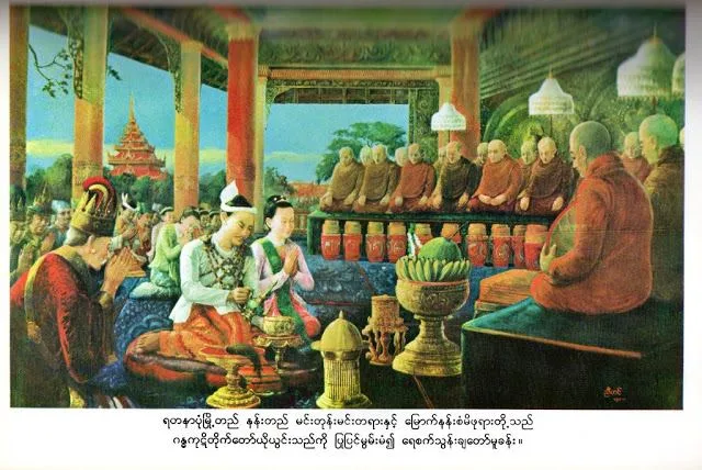 ดังข้อความที่ปรากฏหนังสือ“เมียนม่า-มหามิงกลา-มิงข่านดอ” ว่า “...ชยตุ,, เริ่มแรกแห่งภัททกัปป์นี้ ผู้เป็นกษัตริย์เริ่มจากพระมหาสมตะมินโพธิสัตว์ อันบรรดาเหล่าราชาผู้ประเสริฐได้แบบอย่างพิธีการรับราชาภิเษกมาจากคัมภีร์ทางศาสนาและโลกีย,ปีศักราช 1145-1146 ตำราการรับภิเษกของพระเจ้าทวด ปฐมอมระปุระ,,ผู้ทรงได้ช้างหนุ่ม ปี 1185 ,เมืองรัตนปุระครั้งที่สี่,,ตำราการรับอภิเษกพระเจ้าภะจีดอผู้ทรงธรรม ปี1202,เมืองอมระครั้งที่สอง,, ตำราการรับภิเษกของพระราชบิดาผู้ทรงธรรม ปี1219, เดือนเต็มกะส่ง วันพฤหัสที่ 7 เมืองมัณฑเลย์ยะตะนาปงครั้งที่หนึ่ง,, พระเจ้าทรงธรรม ผู้อุปถัมภ์การสังคายนาครั้งที่ห้า สีริปวระ วิชยานันตยะสะปัณฑิตะ มหาธัมมราชาธิราชา...”