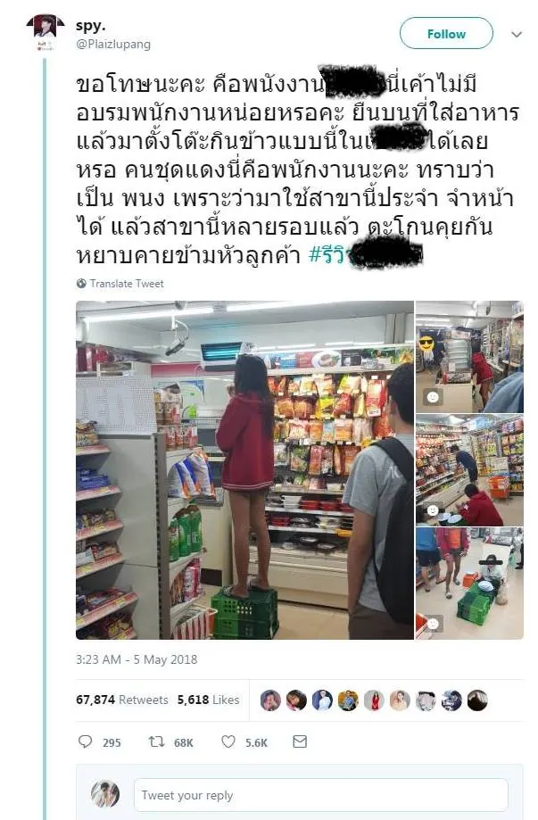 เมื่อวันที่ 6/5/2561 ทางทวิตเตอร์คุณ Plaizlupang ได้ออกมาโพสต์รุปภาพของร้านสะดวกซื้อแห่งหนึ่ง ที่กำลังนั่งกินข้าวกันอย่างอร่อย พร้อมข้อความว่า