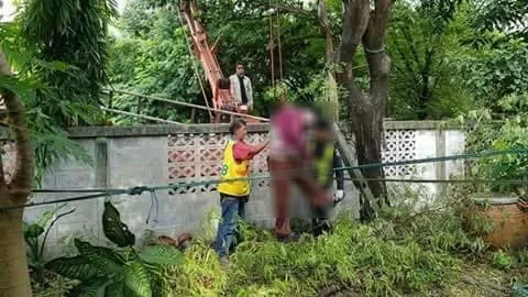 จึงได้ให้เจ้าหน้าที่มูลนิธิร่วมกตัญญูพร้อมด้วย และเจ้าที่เทศบาลเมืองปู่เจ้าสมิงพรายวางแผนในการนำร่างผู้เสียชีวิตลงมา โดยใช้รถกระเช้าของเทศบาลเมืองปู่เจ้าสมิงพราย เพื่อขึ้นไปดำเนินการ นำร่างผู้เสียชีวิตลงมาสู่ด้านล่างด้วยความว่าลำบาก ต้องทำงานที่สูงโดยการใช้เชือกผูกศพและหย่อนศพลงมาสู่พื้นล่าง