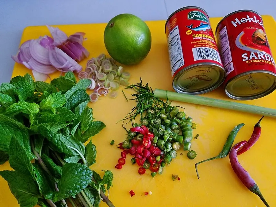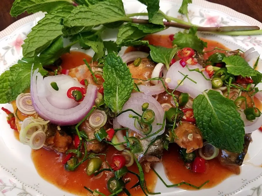 2. เทปลากระป่อง ใส่เครื่องปรุงทั้งหมด มะนาว น้ำปลา แล้วก็ชิมๆ ใบสาระแหน่แปะเพื่อความสวยงาม