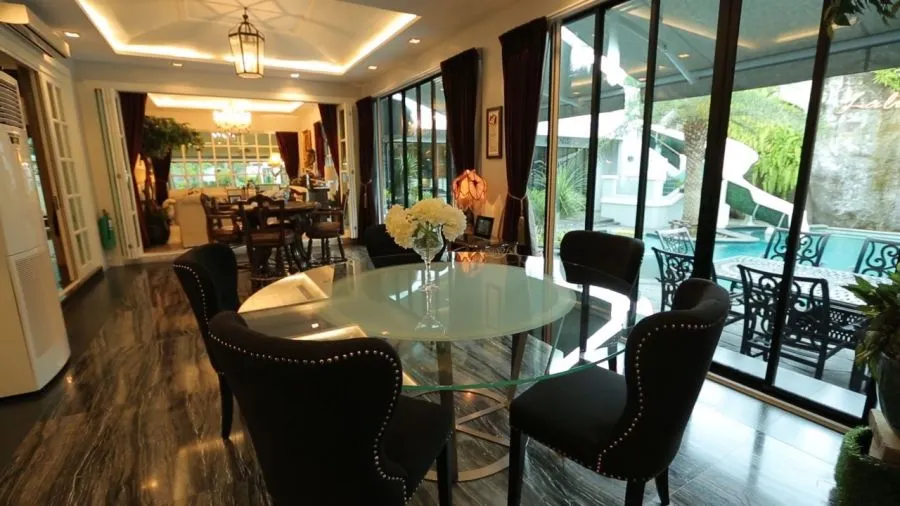 อย่างที่จอดรถด้วยความที่พี่เป๊กเป็นคนชอบรถ สะสมรถ เป็นนั่งแข่งรถด้วย รถก็เลยจะเยอะต้องมีที่จอดรถ 2 ชั้น มุมโต๊ะใหญ่ก็จะเป็นมุมทานข้าว โต๊ะประชุม ข้างนอกจะเป็นสวนน้ำในบ้านเพื่อลูก ซึ่งเขาก็จะมีเพื่อน มีแก๊งค์เขามาเล่น นอกจากนั้นก็มีมุมปาร์ตี้