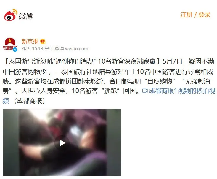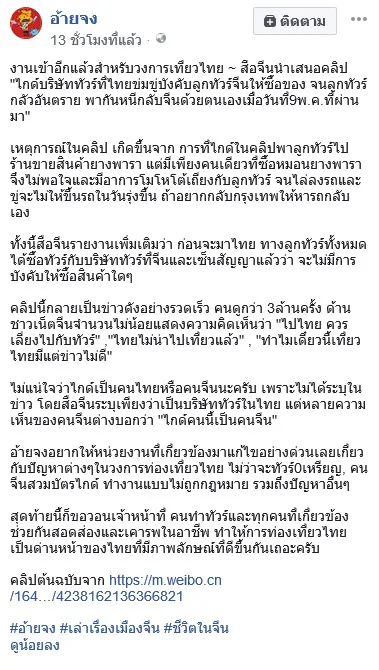 โดยในคลิปไกด์นำเที่ยวในประเทศไทย กับลูกทัวร์จีน เกิดมีปากเสียงกันเหตุเพราะ ไกด์พากลูกทัวร์ไปร้านขายสินค้ายางพารา แต่มีคนซื้อเพียงคนเดียว ทำให้ไกด์ไม่พอใจ โต้เถียงกับลูกทัวร์ จนถึงขั้นไล่ว่าจะไม่ให้ขึ้นรถ ให้เรียกรถกลับกรุงเทพเอาเอง