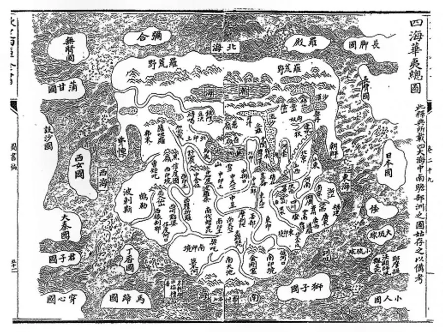 แผนที่ ซื่อไห่ หัวอี๋ จ่งถู (四海華夷總圖) หรือแผ่นที่สี่สมุทร แดนอารยะ แดนคนเถื่อนฉบับสมบูรณ์ ทำขึ้นสมัยราชวงศ์หมิงในปี 1532 ที่มาของภาพ
