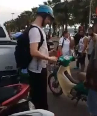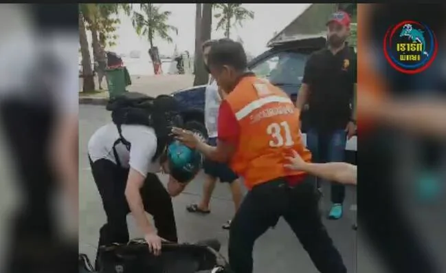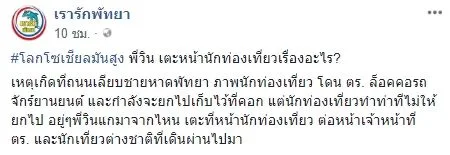 เหตุเกิดที่ถนนเลียบชายหาดพัทยา ภาพนักท่องเที่ยว โดน ตร. ล็อคคอรถจักร์ยานยนต์ และกำลังจะยกไปเก็บไว้ที่คอก แต่นักท่องเที่ยวทำท่าทีไม่ให้ยกไป อยู่ๆพี่วินแกมาจากไหน เตะที่หน้านักท่องเที่ยว ต่อหน้าเจ้าหน้าที่ ตร. และนักเที่ยวต่างชาติที่เดินผ่านไปมา