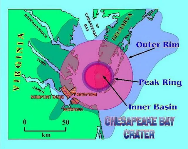 เป็นหลุมที่ถูกฝังอยู่ในโคลนตมใต้ทะเล นอกชายฝั่งของรัฐเวอร์จิเนีย โดยมีอายุราว 35 ล้านปี ซึ่งขนาดของหลุมจะโค้งตามชายฝั่งของอ่าว Chesapeake ที่มีความกว้างราว 85 กิโลเมตร โดยถูกพบครั้งแรกในปี 1983 ซึ่งสามารถเห็นชั้นของพื้นผิวการตกกระทบที่หนาราว 8 นิ้วอยู่ใต้มหาสมุทร
