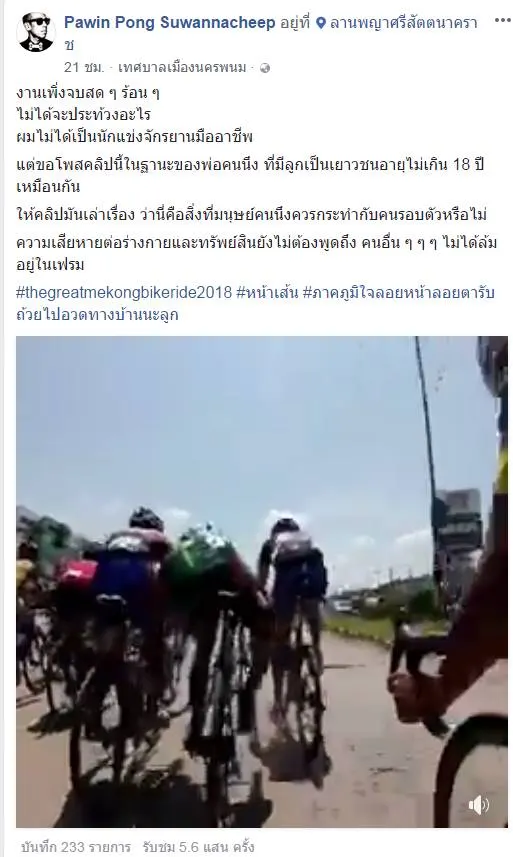 เมื่อวันที่ 21/5/2561 ทางเฟซบุ้ค คุณPawin Pong Suwannacheep ได้โพสต์คลิป ของการแข่งขันปั่นจักรยาน