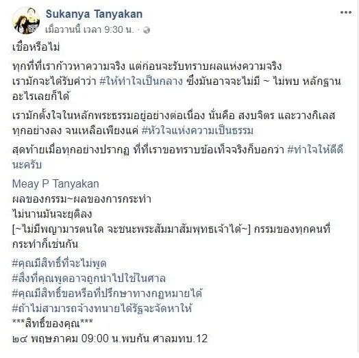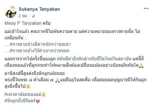 ***สิทธิ์ของคุณ*** ๒๔ พฤษภาคม 09:00 น.พบกัน ศาลมทบ.12" แม่น้องเมย ยังได้โพสต์อาลัยและแสดงความคิดถึงลูกชายด้วยว่า ... "Meay P Tanyakan ครับ แม่เข้าใจแล้ว คนเราหนีไม่พ้นความตาย แต่ความหมายของการตายนั้น ไม่เหมือนกัน... ....#การตายบ้างมีค่าหนักกว่าขุนเขา ....#การตายบ้างไร้ค่าเบากว่าขนนก และการจากไปครั้งนี้ของลูก #มันมีค่ายิ่งนักสำหรับชีวิตใหม่ในสถาบัน แค่นี้ก็เพียงพอแล้วที่ลูกกระทำให้หลายสิ่งต้องเปลี่บนแปลงอย่างฉับพลันทันใด 🙏 อานิสงส์นี้สูงส่งยิ่งนักลูกเอ้ยยยย พรุ่งนี้วันพระ ๘ ค่ำเดือน ๗ 🙏แม่ถืออุโบสถศีล เพื่อต่อยอดบุญบารมีให้กับลูกสูงยิ่งขึ้นไป #เทวดาน้อยของแม่ #รักลูกชั่วนิรันดร์ 💓"