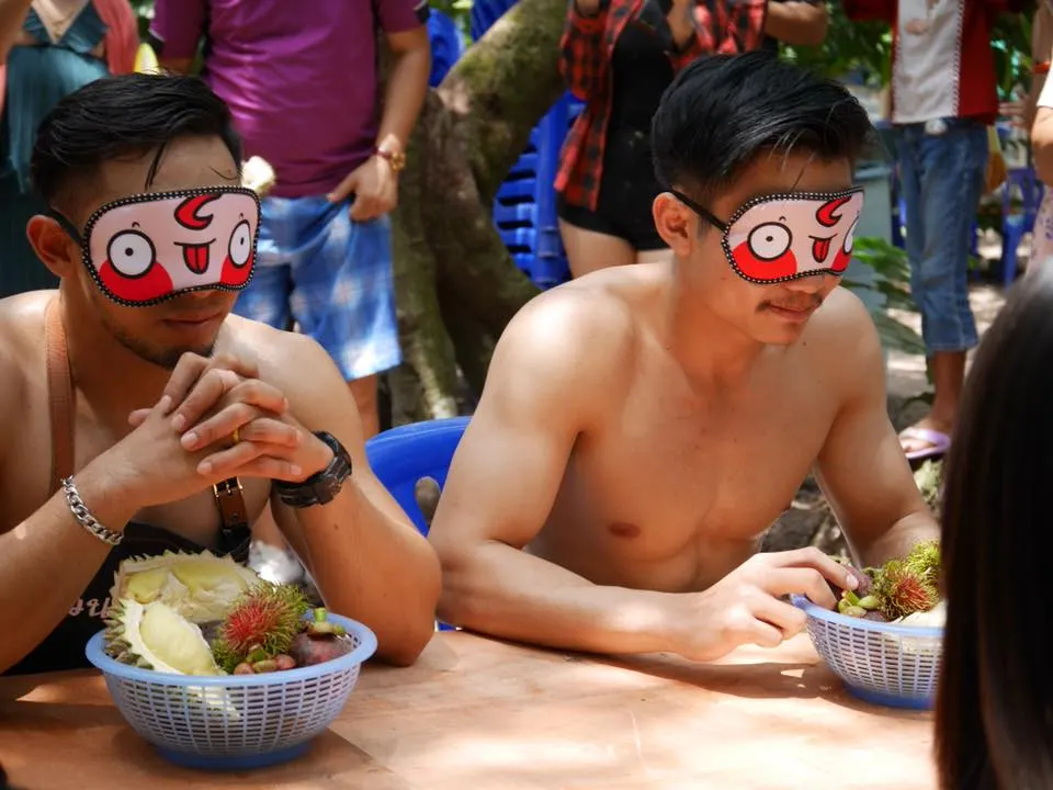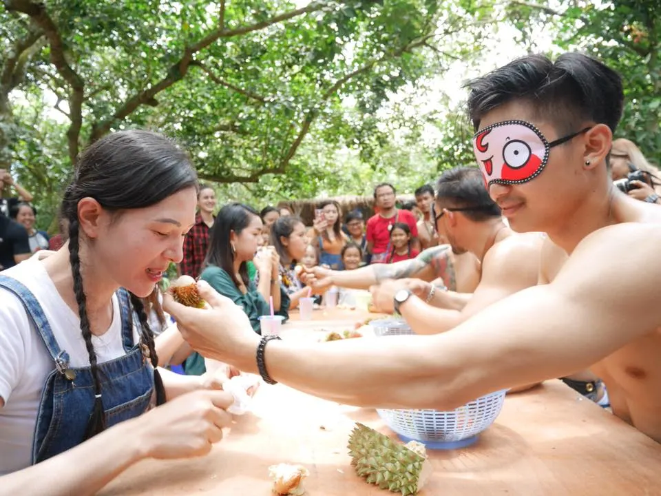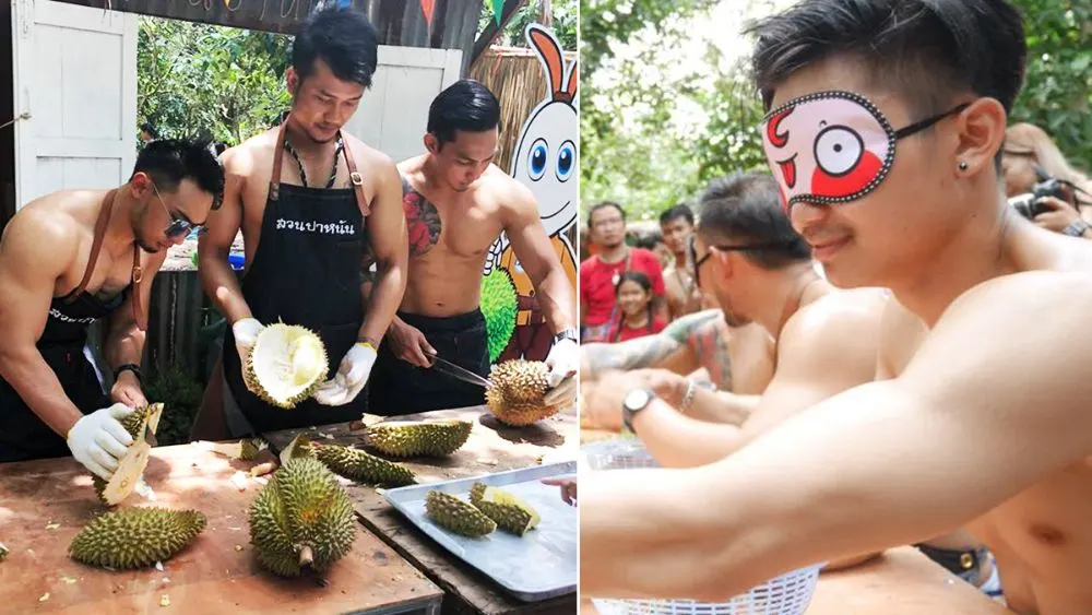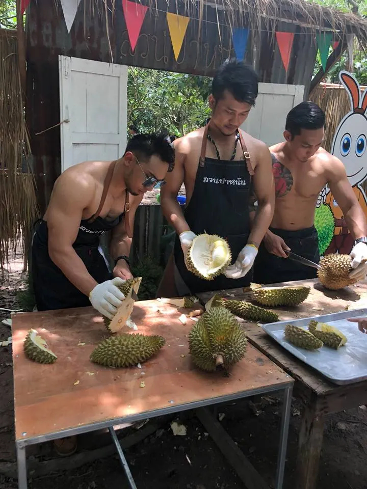 สำหรับสาว ๆ หรือใครที่อยากลองชิมรสชาดทุเรียนหมอนทองพูแน่น ๆ จากสวน เฉลี่ยลูกละ 3 กิโลกรัม ที่มีพ่อค้านักกล้ามปอกเตรียมไว้ให้ทานแบบบุฟเฟ่ต์ จะเจอพ่อค้าได้ เฉพาะวันอาทิตย์เท่านั้น ส่วนใครใจร้อนกลัวต่อคิวนาน อยากซื้อติดไม้ติดมือกลับบ้านไปฝากคนที่บ้าน มีบริการปอกอีก 2 ซุ้ม แต่ไม่ใช่หนุ่ม ๆ นักกล้ามแบบนี้นะฮ่ะ เต้ยบอกเลย