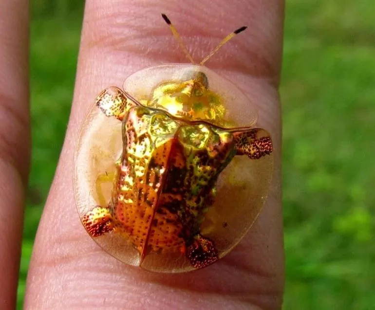 ตัวสามเป็นด้วงที่เหมือนกับแมลงเต่าทองสีสันสวยงามอย่าง Golden Tortoise Beetle พวกมันมีชื่อทางวิทยาศาสตร์ว่า Aspidimorpha sanctaecrucis พบได้ในหลายพื้นที่ (แถวบ้านผู้เขียนก็เห็นเยอะ) ชอบอาศัยอยู่ตามใบของพืชในวงศ์ผักบุ้ง ตัวโตเต็มที่ยาว 14 มิลลิเมตร ลำตัวเป็นสีทองเหมือนใส่เกราะสวยงามากๆ