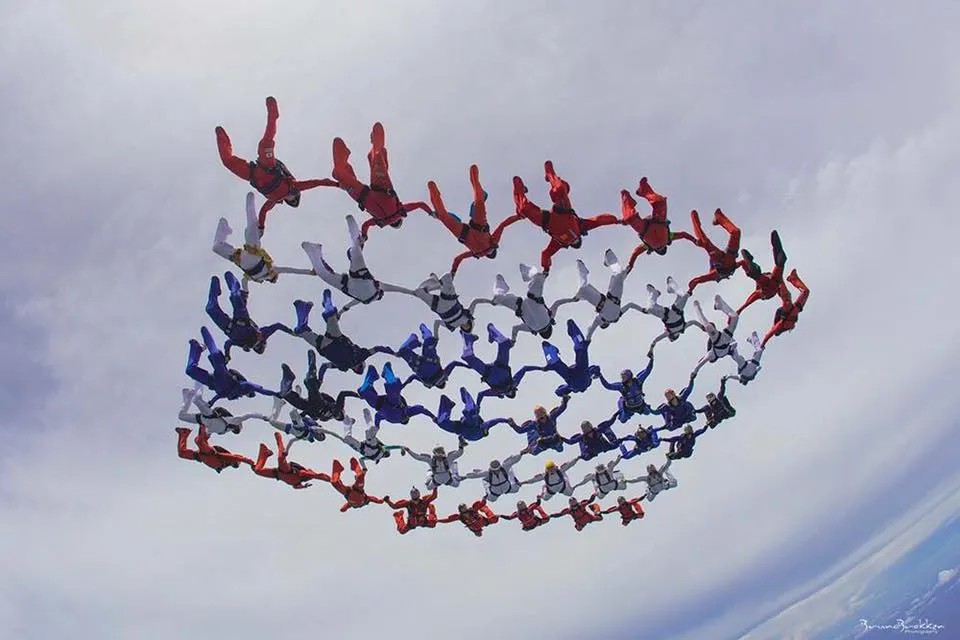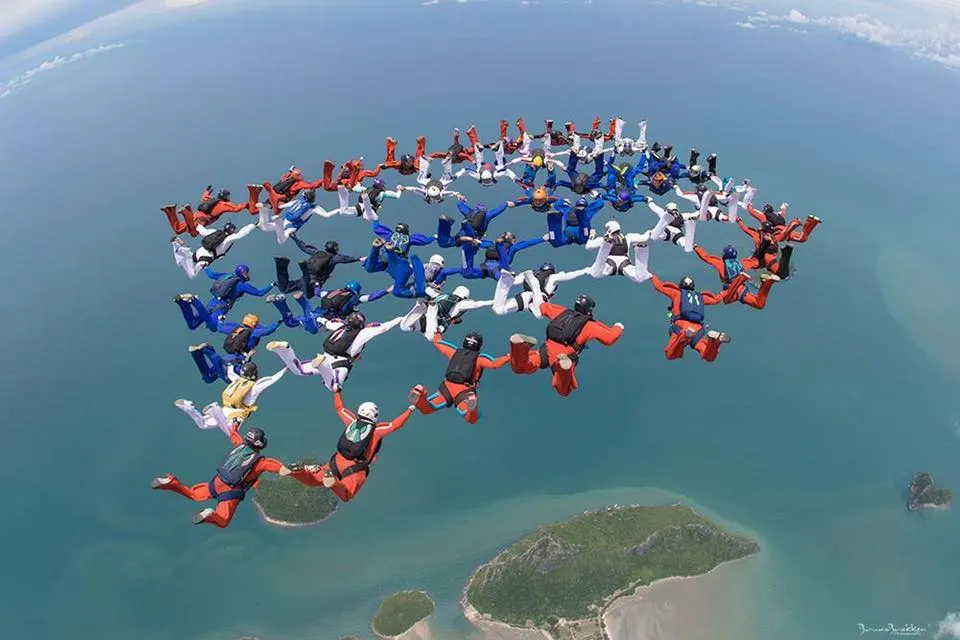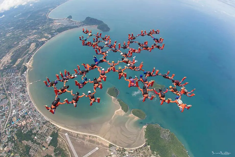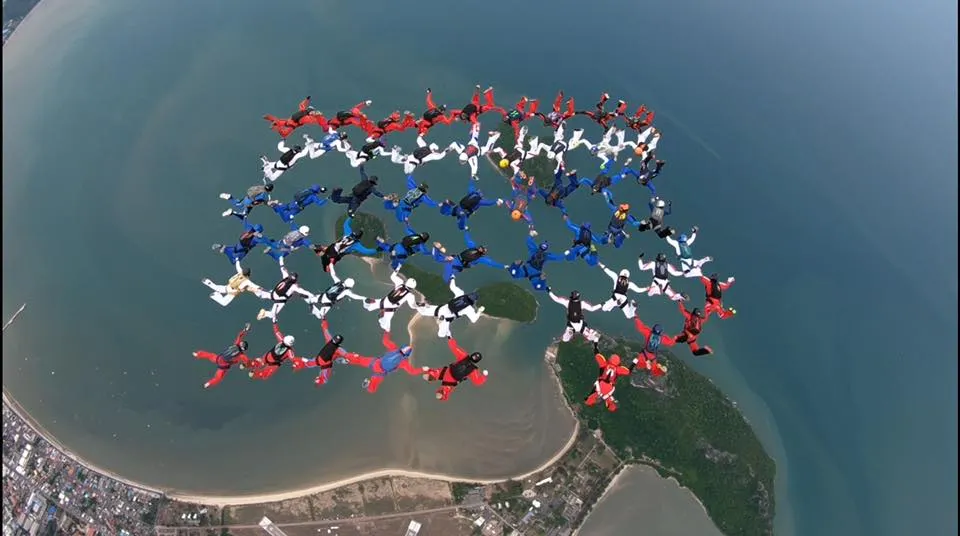 รวมภาพกลางเวหา ของ นักกระโดดร่มจาก 16 ชาติ รวมทั้ง ทหารรบพิเศษ ทบ.ไทย ที่เกาะหมู่ เป็นรูปธงชาติไทย เหนือ อ่าวมะนาว กองบิน5 ประจวบคีรีขันธ์