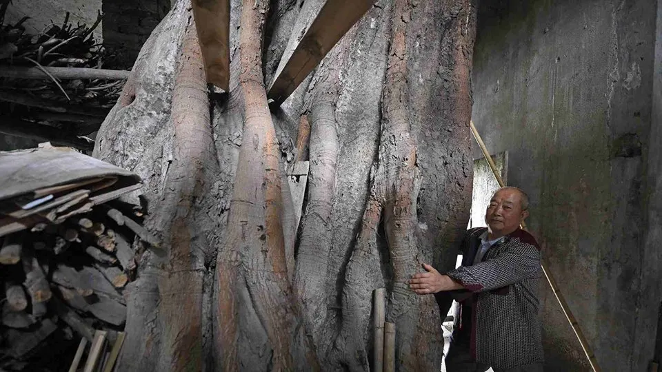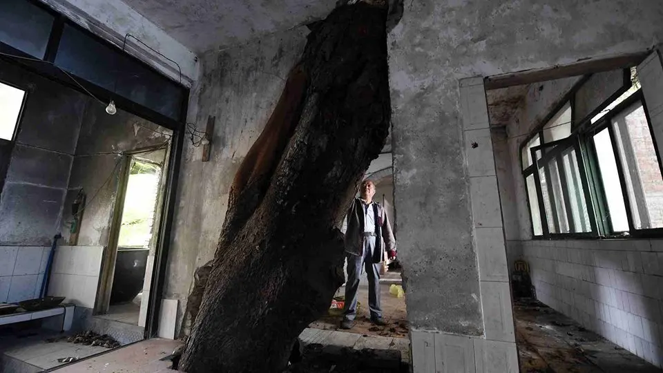 นายหวง โปหรง ชายผู้เป็นเจ้าของอาคารหลังดังกล่าวเล่าว่าตัวอาคารถูกสร้างขึ้นในช่วงทศวรรษ 1980 หรือเมื่อราว 30 ปีก่อน โดยเขาตัดสินใจกั้นแบ่งพื้นที่ไว้ให้ต้นไม้เก่าแก่หลายต้น ซึ่งต้นไม้ที่เป็นจุดเด่นผุดโผล่ออกมาจากกลางอาคารนั้นมีอายุกว่า 400 ปีแล้ว