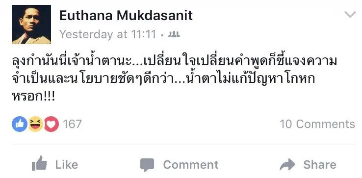 "ลุงกำนันนี่เจ้าน้ำตานะ…เปลี่ยนใจเปลี่ยนคำพูดก็ชี้แจงความจำเป็นและนโยบายชัดๆดีกว่า…น้ำตาไม่แก้ปัญหาโกหกหรอก!!!"