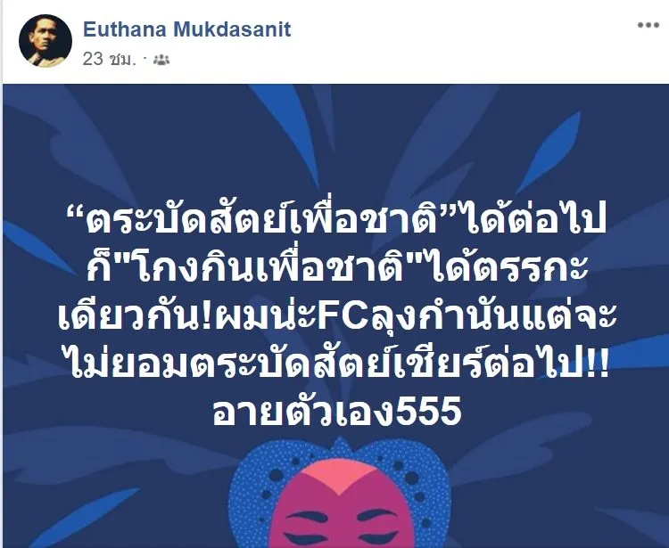 "ตระบัดสัตย์เพื่อชาติ”ได้ต่อไปก็”โกงกินเพื่อชาติ”ได้ ตรรกะเดียวกัน! ผมน่ะFCลุงกำนันแต่จะไม่ยอมตระบัดสัตย์เชียร์ต่อไป!! อายตัวเอง555"