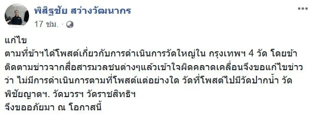ทั้งนี้ล่าสุด นายพิสิฐชัย สว่างวัฒนากร ได้โพสท์เฟซบุ๊คแก้ข่าวว่าเป็นความเข้าใจผิดที่ได้โพสท์ไปก่อนหน้านี้