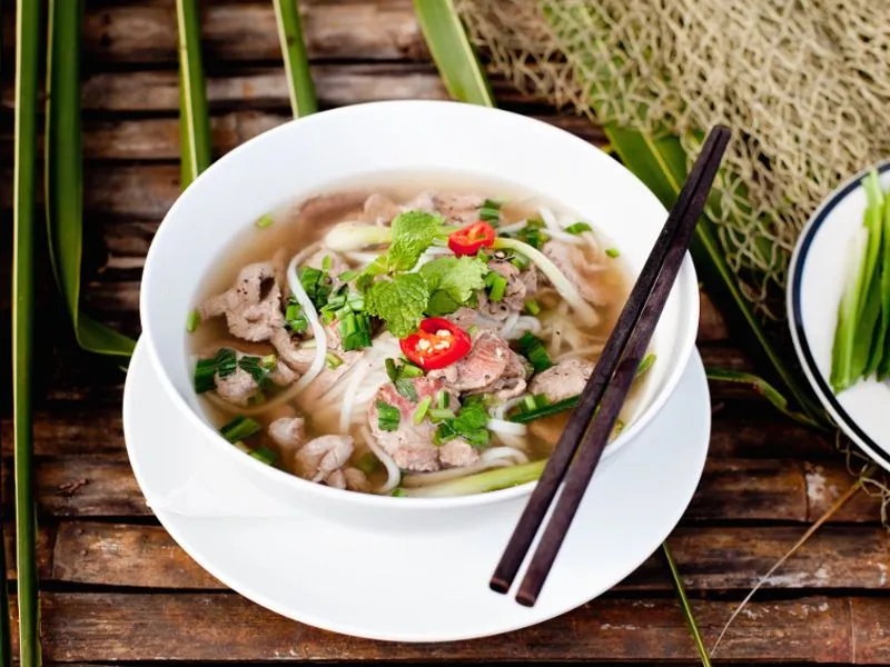 ปิดท้ายด้วยเฝอ อาหารเวียดนามที่ขึ้นชื่อ และคิดว่าคนไทยก็น่าจะรู้จักกันเยอะ เฝอเป็นก๋วยเตี๋ยวหน้าตาคล้ายๆ กับก๋วยเตี๋ยวของบ้านเรานี่แหละค่ะ แต่จะมีขนาดของเส้นก๋วยเตี๋ยวที่หนากว่า น้ำซุปมีรสเค็มเล็กน้อย และมีกลิ่นเครื่องเทศ เช่น อบเชย ดอกจัน กานพลู ผักชีฝรั่ง ต้นหอม ก่อนกินจะมีเครื่องปรุง 4 อย่างคือ มะนาว โหระพา ถั่วงอก และพริก ให้เลือกใส่ได้ตามชอบ