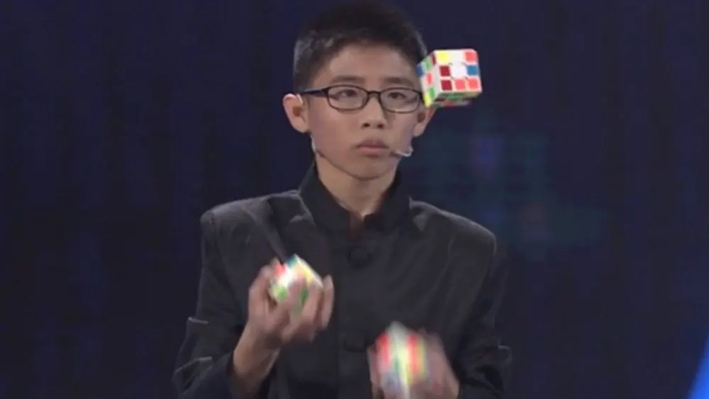 น้องคนนี้อายุ 13 ปีชื่อ Que Jianyu จากประเทศจีน เพิ่งทำลายสถิติโลกในการแก้รูบิคพร้อมกัน 3 อันขณะที่โยน (juggling) ไปด้วย น้องฝึกยังไงเนี่ย ดูหน้าน้อง...ชิลมาก