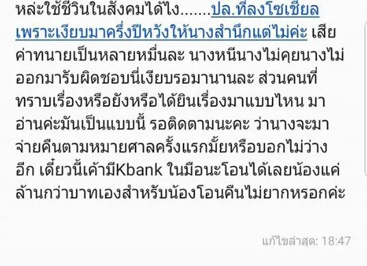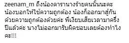 “ถึงน้องดารานางร้ายคนนั้นนะคะ น้องบอกให้ใช้ความถูกต้อง น้องก็ออกมาสู้กันด้วยความถูกต้องด้วยค่ะ พี่เงียบเสียเวลามาครึ่งปีแล้วค่ะ นางไม่ออกมารับผิดชอบเลยต้องทำไงคะ” พร้อมกับข้อความที่เป็นรูปภาพ ทำเอาเหล่าบบรรดาแฟนคลับอยากรู้เลยว่า “น้องนางร้ายคนดัง” ที่ว่าเป็นไครกัน