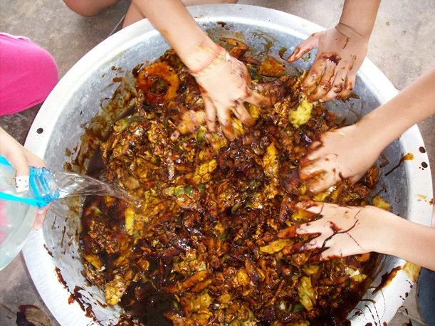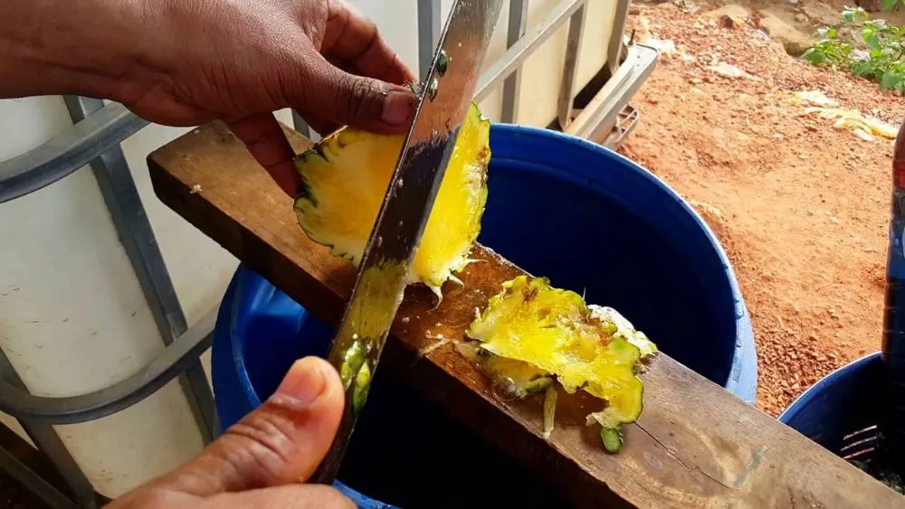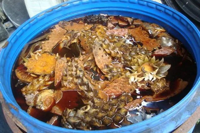 สับหรือบดสับปะรดทั้งหัวแบบไม่ต้องปลอกเปลือก ผสมทุกอย่างให้เข้ากันทั้งไว้ 3 วัน