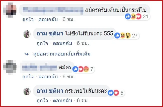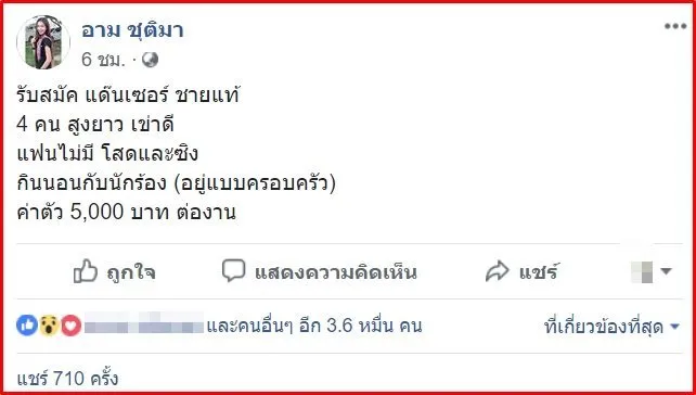 แต่ล่าสุดสาว "อาม" ก็ได้ออกมาโพสต์ผ่านเฟซบุ๊กส่วนตัวประกาศตามหาผู้ชายซิง พร้อมระบุข้อความว่า "รับสมัคร แด๊นเซอร์ ชายแท้ 4 คน สูงยาว เข่าดี แฟนไม่มี โสดและซิง กินนอนกับนักร้อง (อยู่แบบครอบครัว) ค่าตัว 5000 บาท ต่องาน" โอ้โห งานนี้ทำเอาแฟนคลับถึงกับใจหายแวบกันเลยทีเดียว ทีไหนได้ประกาศรับสมัครแดนเซอร์นี่เองจ้าาาา