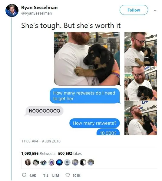 มิหนำซ้ำ หนุ่มก็ไม่ได้เป็นคนดังหรือเน็ตไอดอลที่ไหน เป็นแค่ผู้ชายธรรมดา แต่ด้วยความที่อยากลองก็เลยตัดสินใจรีทวิตภาพสุนัขน้อยกับเขา โดยเขาเริ่มโพสตอนบ่ายของวันนั้น และวันถัดมามันก็เริ่มมียอดรีทวิต 222 ครั้ง ซึ่งก็ทำให้เค้าแอบมีหวัง ก่อนที่ไปๆมาๆ มันก็ถูกกระจายออกไปอย่างมหาศาลสู่ยอดประมาณ 149,000 รีทวิต Sesselman แทบไม่อยากจะเชื่อกับเรื่องที่เกิดขึ้น แน่นอนว่าแม่ของเค้าก็เช่นกัน