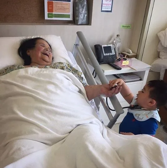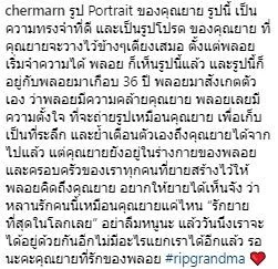 “ของคุณยาย รูปนี้ เป็นความทรงจำที่ดี และเป็นรูปโปรด ของคุณยาย ที่คุณยายจะวางไว้ข้างๆเตียงเสมอ ตั้งแต่พลอยเริ่มจำความได้ พลอย ก็เห็นรูปนี้แล้ว และรูปนี้ก็อยู่กับพลอยมาเกือบ 36 ปี พลอยมาสังเกตตัวเอง ว่าพลอยมีความคล้ายคุณยาย พลอยเลยมีความตั้งใจ ที่จะถ่ายรูปเหมือนคุณยาย เพื่อเก็บเป็นที่ระลึก และย้ำเตือนตัวเองถึงคุณยายได้จากไปแล้ว แต่คุณยายยังอยู่ในร่างกายของพลอย และครอบครัวของเราทุกคนที่ยายสร้างไว้ให้ พลอยคิดถึงคุณยาย อยากให้ยายได้เห็นจัง ว่าหลานรักคนนี้เหมือนคุณยายแค่ไหน “รักยายที่สุดในโลกเลย” อย่าลืมหนูนะ แล้ววันนึงเราจะได้อยู่ด้วยกันอีกไม่มีอะไรแยกเราได้อีกแล้ว รอนะคะคุณยายที่รักของพลอย”