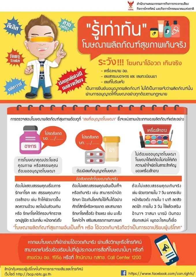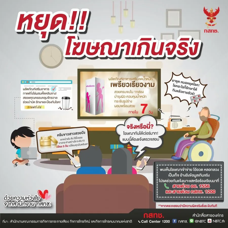 โฆษณาเกินจริง บนสื่อโทรทัศน์ ที่เป็นประเด็นร้อนในช่วงหลายสัปดาห์ที่ผ่านมา ทาง กสทช. โดยสำนักคุ้มครองผู้บริโภคในกิจการกระจายเสียงและโทรทัศน์ ได้จัดทำ Infographic ในเรื่อง รู้เท่าทันโฆษณาผลิตภัณฑ์สุขภาพเกินจริง ระวังคำโฆษณาเกินจริง เพื่อความปลอดภัยต่อชีวิตของคุณเอง