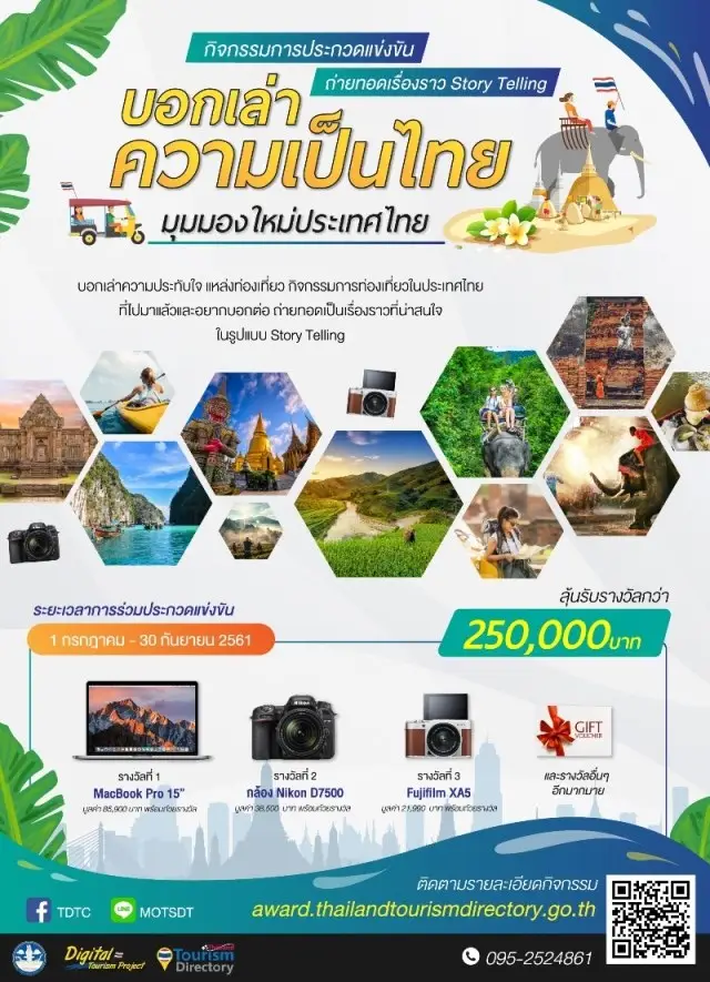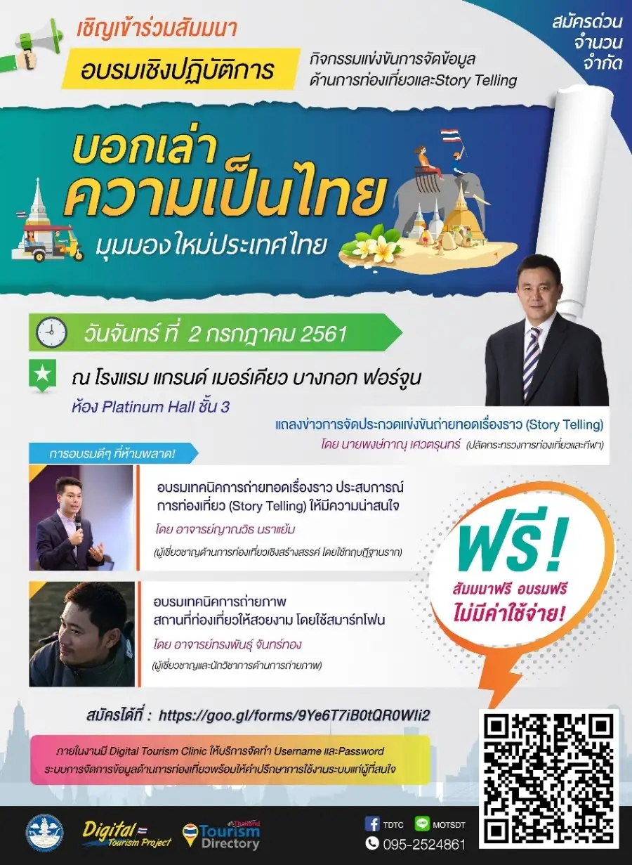 **…. กระทรวงการท่องเที่ยวและกีฬา เดินหน้าเต็มสูบสู่การท่องเที่ยวยุค 4.0 ขอเชิญร่วมงานแถลงข่าวการประกวดแข่งขันจัดทำข้อมูลดิจิทัล เพื่อการบริการด้านท่องเที่ยวระดับประเทศปี 2561 กิจกรรมการประกวดแข่งขันถ่ายทอดเรื่องราวความประทับใจแหล่งท่องเที่ยวในประเทศไทยที่ไปสัมผัสมา แล้วอยากบอกต่อในรูปแบบ Story Telling หัวข้อ "บอกเล่าความเป็นไทย มุมมองใหม่ประเทศไทย" ...**...และ ขอเชิญผู้ที่สนใจเข้าร่วมสัมมนาเชิงปฏิบัติการเรียนรู้เคล็ดลับการถ่ายทอดเรื่องราวประสบการณ์การท่องเที่ยว (Story Telling) และอบรมเทคนิคการถ่ายภาพด้วย Smart Phone โดยผู้เชี่ยวชาญ ฟรี !! พร้อมฟังทำความเข้าใจในกติกาการแข่งขัน ในวันที่ 2 กรกฎาคม 2561 เวลา 9.30 น.ณ ห้อง Grand Ballroom ชั้น 3 โรงแรมแกรนด์ เมอร์เคียว บางกอก ฟอร์จูน (MRT สถานีพระราม 9) ดูรายละเอียดเพิ่มเติมได้ที่ award.thailandtourismdirectory.go.th