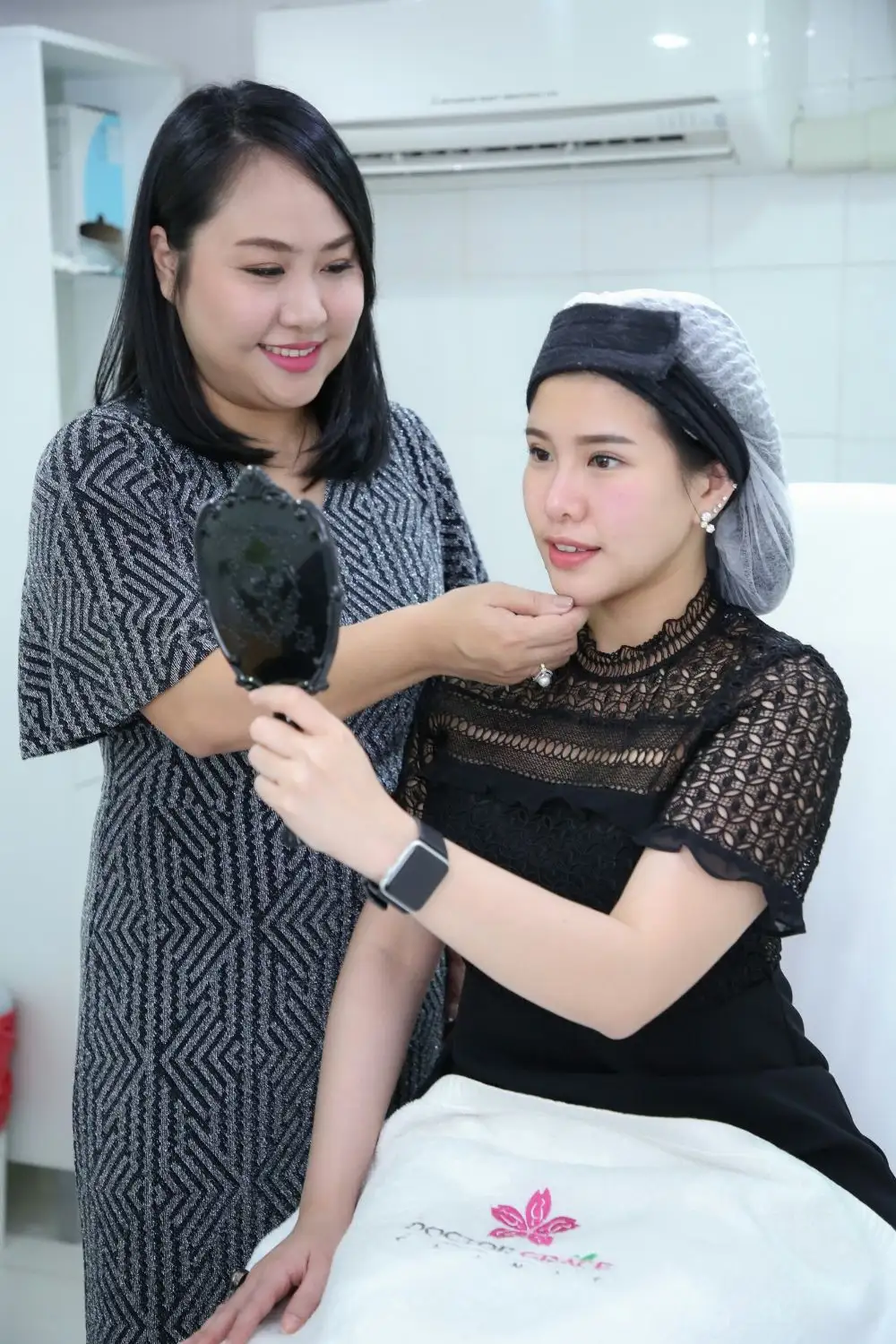 นอกจากนี้ก็มีการปรับรูปหน้าอีกนิดๆ หน่อยๆ ด้วยการฉีดไหมยกกระชับปรับรูปหน้า ซึ่งการฉีดไหมนั้นจะแตกต่างกับการร้อยไหม และฝ้ายเลือกมาทำกับคุณหมอเกรซ พญ.เสาวภาคย์ พงศ์ศศิธร ที่ ด็อกเตอร์เกรซ คลินิก คือก่อนหน้านั้นฝ้ายก็เคยมาให้คุณหมอดูแลในส่วนอื่นๆ และมันก็โอเคมากๆ จากที่เราเคยกลัวเรื่องการทำอะไรแบบนี้มันก็มั่นใจขึ้น ครั้งนี้เลยตัดสินใจทำฟิลเลอร์ใต้ตา และฉีดไหม ซึ่งหมอเกรซก็ไม่ทำให้ผิดหวัง