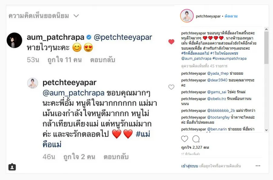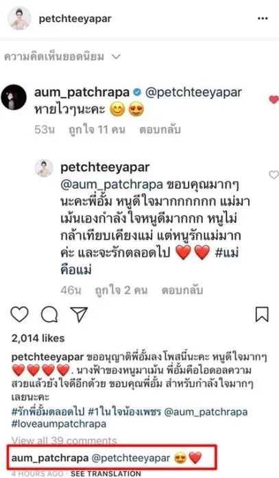“ขออนุญาตพี่อั้มลงโพสต์นี้นะคะ หนูดีใจมากๆ นางฟ้าของหนูมาเม้นต์ พี่อั้มคือไอดอลความสวยแล้วยังใจดีอีกด้วย ขอบคุณพี่อั้ม สำหรับกำลังใจมากๆเลยนะคะ #รักพี่อั้มตลอดไป #1ในใจน้องเพชร @aum_patchrapa #loveaumpatchrapa”
