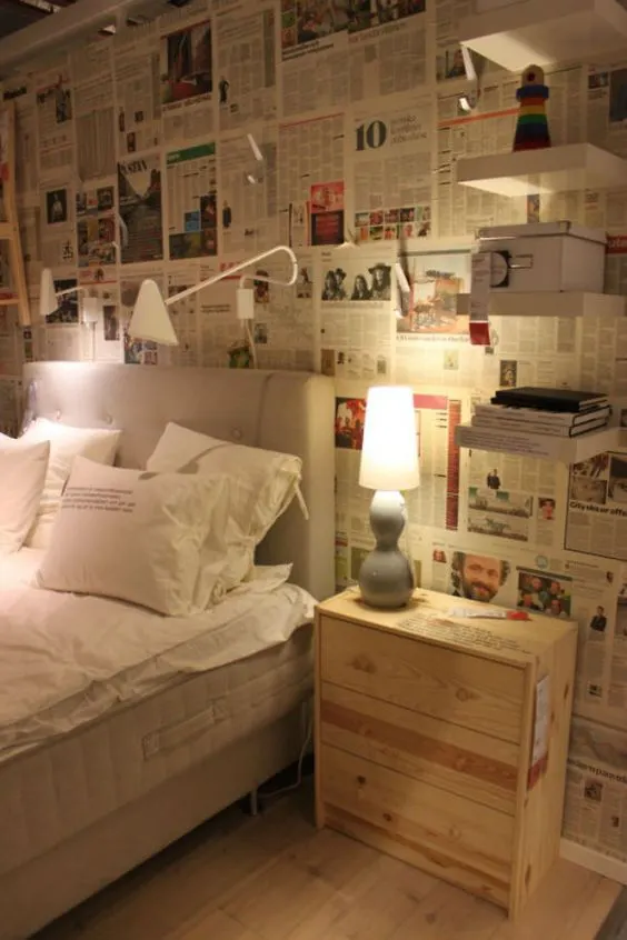 ไอเดียการตกแต่งสไตล์นี้เป็นแนววินเทจย้อนยุค เราต้องทำการเลือกหน้าหนังสือพิมพ์ที่มีโทนสีขาว-ดำ เพื่อสร้างความวินเทจและความเก่าให้กับห้อง แต่ไม่ต้องกังวลไปเลยเพราะหนังสือพิมพ์ภาษาอังกฤษยังมีขายตามท้องตลาดอยู่ในราคา 80-100 บาท