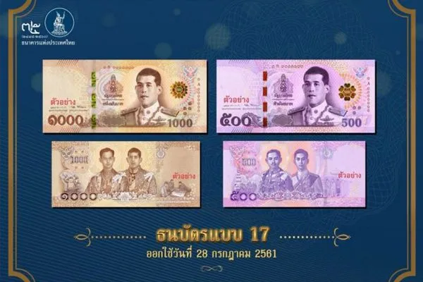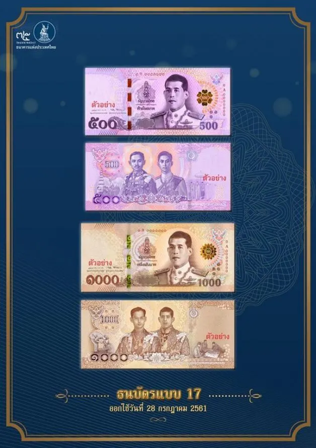 วันนี้ ( 3 กรกฎาคม 2561 ) ธนาคารแห่งประเทศไทยได้ประกาศว่าจะออกธนบัตรแบบใหม่ แบบ 17 ชนิดราคา 500 บาท และ 1000 บาท เนื่องในวันเฉลิมพระชนมพรรษา สมเด็จพระเจ้าอยู่หัวมหาวชิราลงกรณ บดินทรเทพยวรางกูร ในวันที่ 28 กรกฎาคม 2561 ตามที่ได้รับพระราชทานพระราชานุญาตจากสมเด็จพระเจ้าอยู่หัวมหาวชิราลงกรณ บดินทรเทพยวรางกูร ให้จัดพิมพ์และออกใช้ธนบัตรแบบใหม่ เพื่อใช้เป็นธนบัตรหมุนเวียนทั่วไป