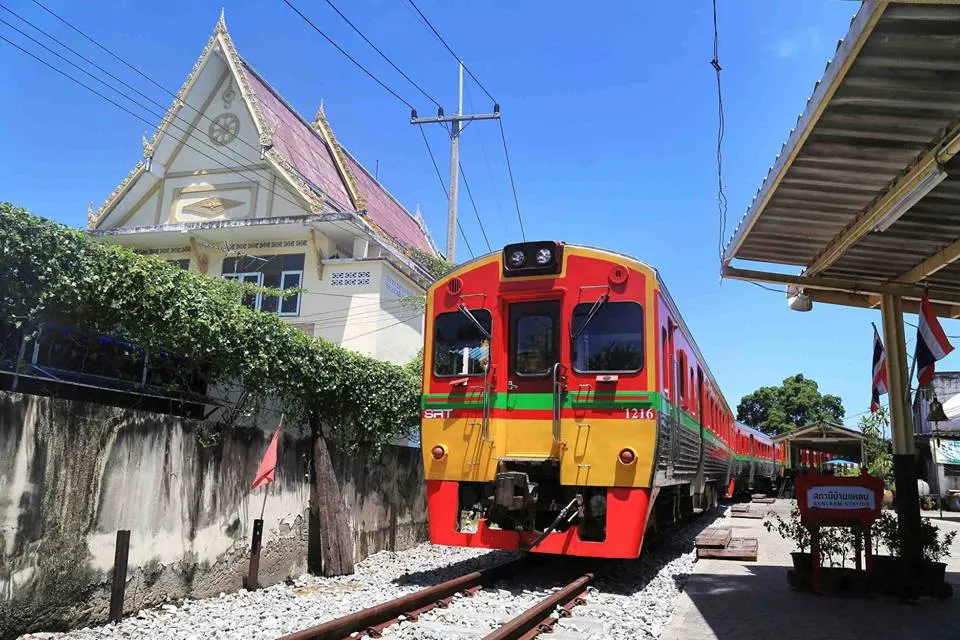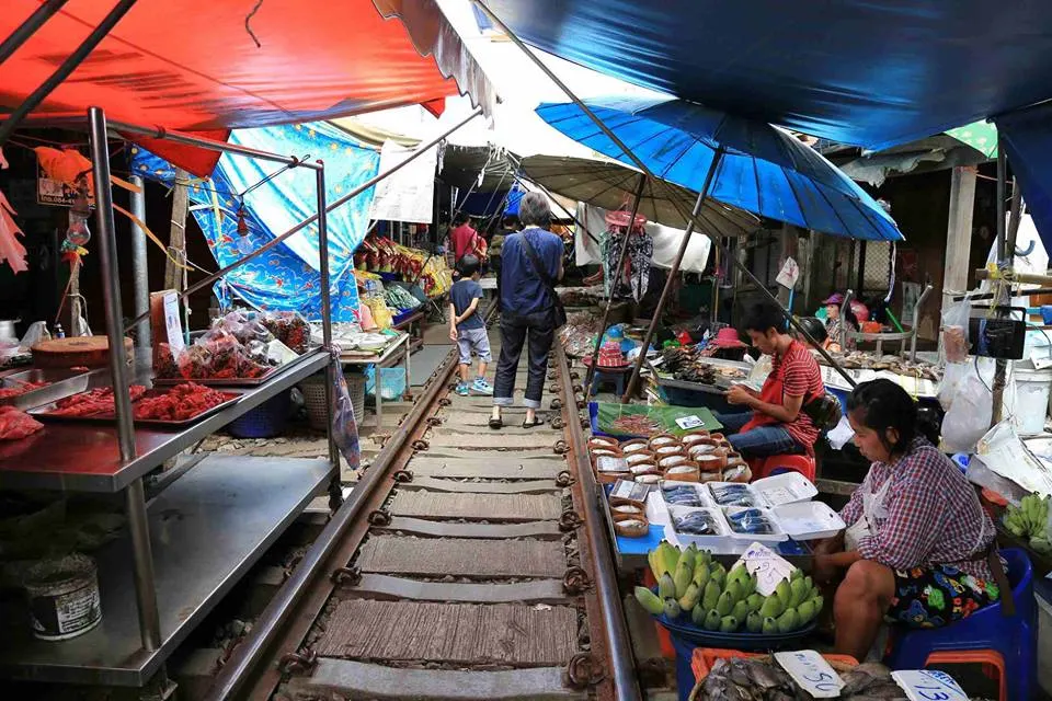 แต่ละวันจะมีรถไฟวิ่งผ่านเส้นทางดังกล่าวราวแปดเที่ยว โดยสถานีรถไฟจะคอยส่งสัญญาณเสียงไซเรนก่อนรถไฟจะมาถึง เพื่อเตือนพ่อค้าแม่ค้าให้เก็บข้าวของ รวมถึงร่มหรือกันสาดผ้าใบที่กลายเป็นที่มาของชื่อตลาด ซึ่งปัจจุบันถือเป็นอีกหนึ่งจุดท่องเที่ยวยอดนิยมของชาวไทยและชาวต่างชาติ