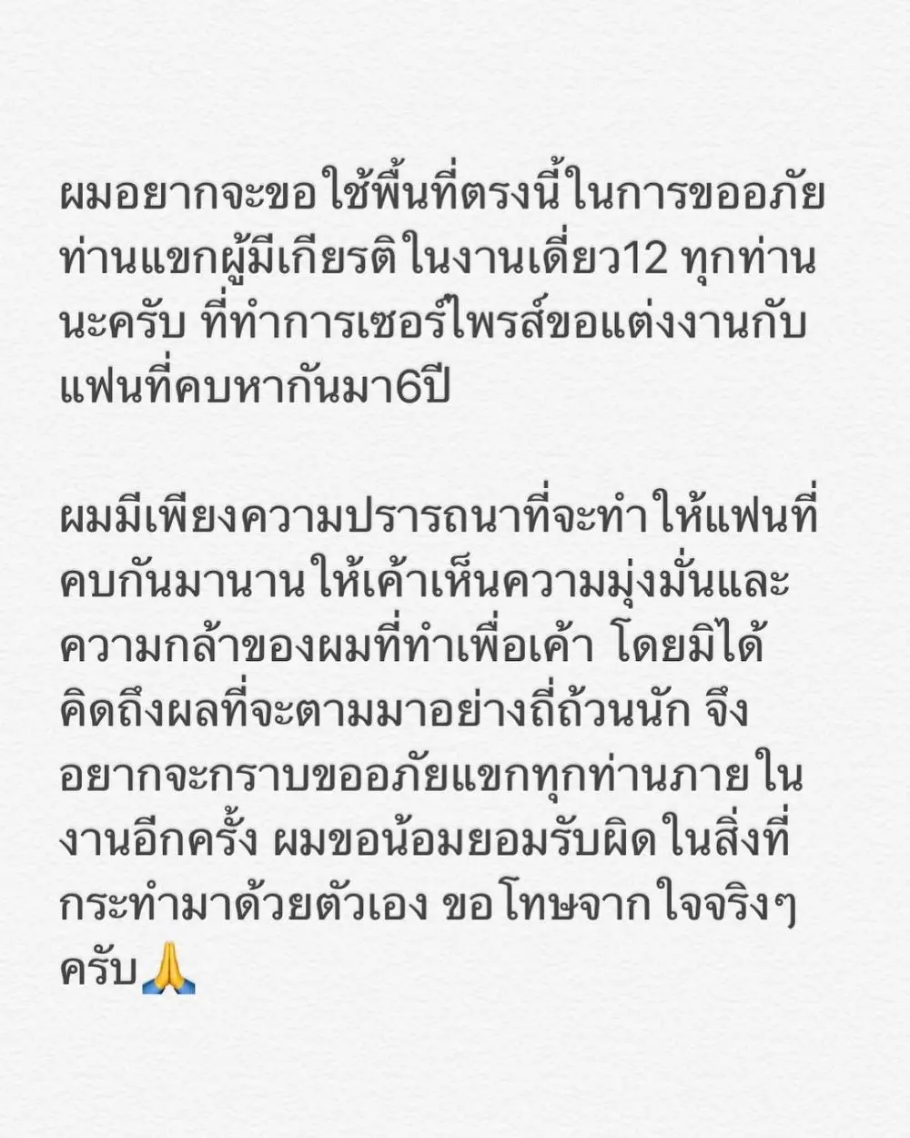 แต่ก็มีฝั่งที่ร่วมยินดี และไม่ได้วิจารณ์อะไร หลังจากเกิดกระแสดราม่าดังกล่าว ทางด้านว่าที่เจ้าบ่าวอย่าง “โตชิ ศิริจิวานนท์” ก็ได้ออกมาขอโทษผ่านอินสตาแกรม ระบุประมาณว่า “กราบขออภัยแขกทุกท่านในงานอีกครั้ง ผมเพียงปรารถนาให้แฟนที่คบมานานเห็นถึงความมุ่งมั่นและความกล้าโดยไม่ทันคิดถึงผลที่ตามมา”