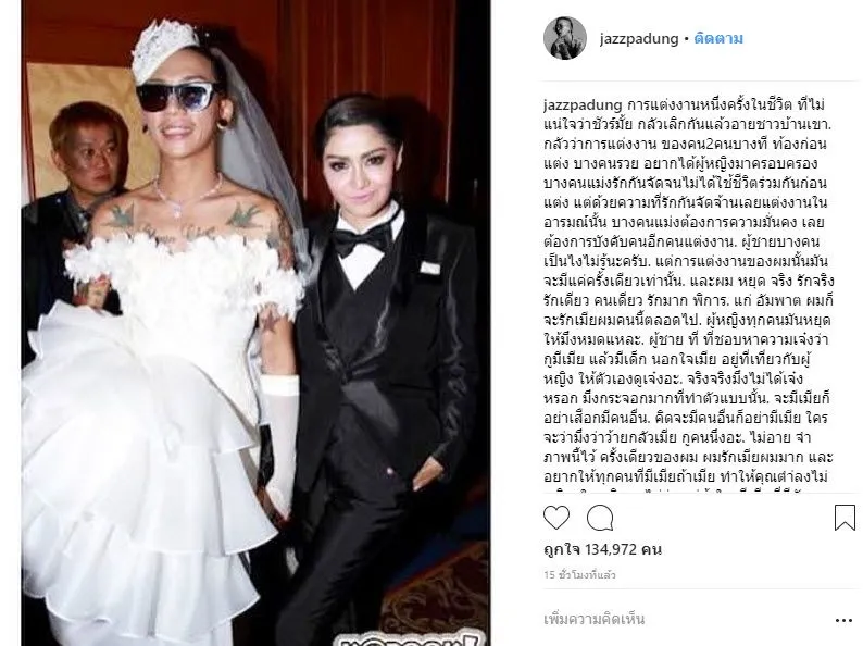 แจ๊ส ชวนชื่น โพสต์ภาพคู่ภรรยาสาวในชุดแต่งงานในไอจี พร้อมเขียนข้อความว่า ....