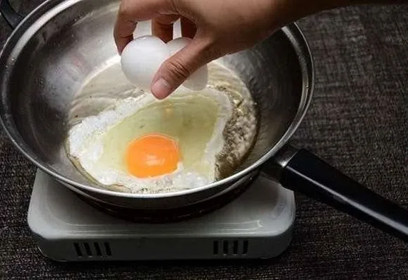 2. ตอกไข่ใส่ลงไปในกระทะ แม้ว่าน้ำมันจะไม่ร้อน แต่เนื่องจากเราตั้งกระทะทิ้งไว้ก่อนหน้านี้ กระทะจึงมีความร้อนสูง ดังนั้นเมื่อตอกไข่ลงไปจึงต้องรีบปรับไฟให้อ่อนลง เพราะถ้าหากว่าเราไม่รีบเบาไฟให้อ่อนลง จะทำให้ไข่ขาวไหม้เร็วแต่ ไข่แดงไม่สุก