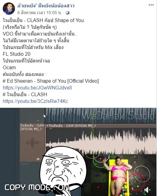 สำหรับผู้ที่ออกมาทำคลิปเทียงเสียงเพลงดังกล่าวถึงประเด็นนี้ได้โพสท์ระบุว่า ใจเย็นเย็น - CLASH ก๊อป Shape of You (จริงหรือไม่ ? ไปดูกันชัด ๆ) VDO นี้ทำมาเพื่อความบันเทิงเท่านั้น.. ไม่ได้มีเจตตานาใส่ร้ายใด ๆ ทั้งสิ้น โปรแกรมที่ใช้สำหรับ Mix เสียง FL Studio 20โปรแกรมที่ใช้อัดหน้าจอ Ocam