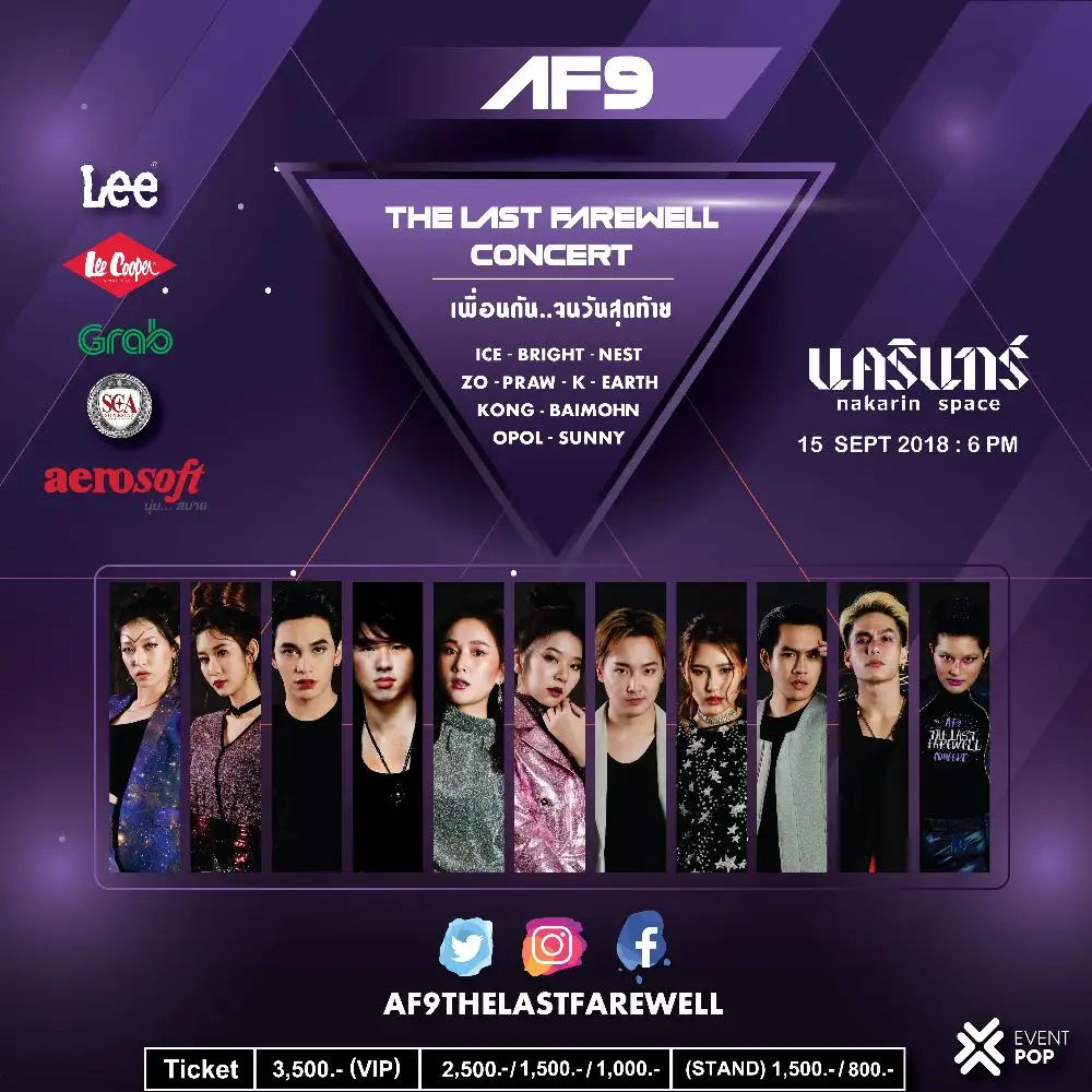 พบกับความสนุกแบบจัดเต็มทั้งแสงสีเสียง พลาดไม่ได้ ในวันเสาร์ที่ 15 กันยายน 2561 เวลา 18.00 น. ที่ นครินทร์สเปซ ถนนศรีนครินทร์ สาวก AF ห้ามพลาด ติดตามรายละเอียดเพิ่มเติมได้ที่ https://www.eventpop.me ราคาบัตร 3,500 ( VIP) 2,500 / 1,500 / 1,000 / 800 (STAND) บาท พร้อมติดตามการเดินสายโปรโมตได้ที่ Instagram/Facebook/Twitter @af9thelastfarewell