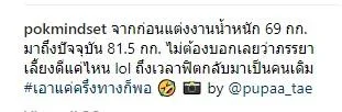 โดยหนุ่มป๊อกได้โพสต์ภาพตัวเองขณะออกกำลังกาย พร้อมกับข้อความบรรยายว่า "จากก่อนแต่งงานน้ำหนัก 69 กก. มาถึงปัจจุบัน 81.5 กก. ไม่ต้องบอกเลยว่าภรรยาเลี้ยงดีแค่ไหน ถึงเวลาฟิตกลับมาเป็นคนเดิม"