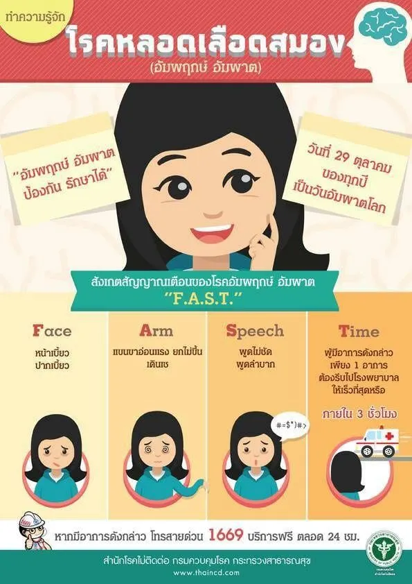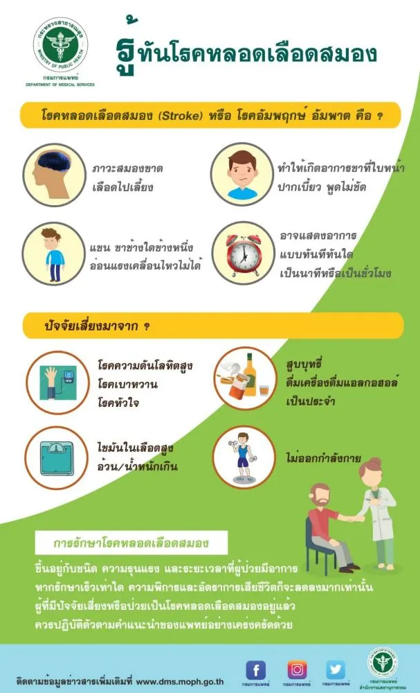 หรือพบผู้ที่มีอาการตามสัญญาณเตือนข้างต้นให้รีบปรึกษาแพทย์และรับการรักษาอย่างต่อเนื่อง เพื่อป้องกันการเกิดโรคหลอดเลือดสมองที่จะเกิดได้ในภายหลัง