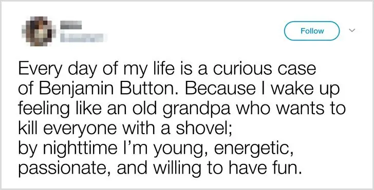 4. ทุกวันของฉันเหมือนชีวิตของเบนจามิน บัตตัน เพราะตอนฉันตื่นฉันรู้สึกเหมือน คุณปู่แก่ ๆ ที่อยากจะเอาพลั่วฆ่าทุก แต่พอตกดึก ฉันเต็มไปด้วยพลัง ความคลั่งอยากมีความสุข