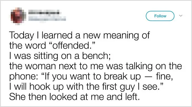 8. คนนี้บอกว่า " วันนี้ฉันได้เรียนรู้ความหมายใหมาของคำว่าการถูกรุกราน , ฉันกำลังนั่งอยู่ที่ม้านั่ง ผู้หญิงคนหนึ่งนั่งถัดจากฉัน ผู้โทรศัพท์ ถ้าคุณอยากจะเลิก ก็ได้ จะ...กับผู้ชายคนแรกที่เจอ เธอมองมาที่ฉันแล้วก็จากไป. "