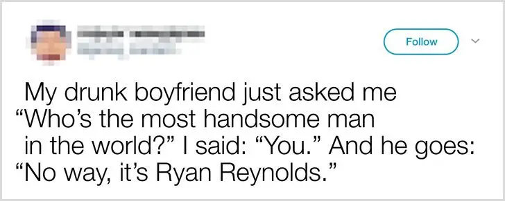 18. คนนี้บอกว่า"แฟนขี้เมาถามฉันว่าใครที่หล่อที่สุดในโลก ฉันตอบเขาว่า เธอ เขาบอก ไม่มีทาง ไรอัน เรย์โหนดต่างหาก"