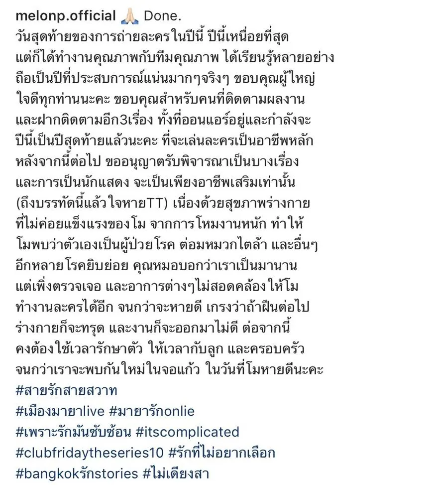 เมื่อ แตงโม นิดา ออกมาโพสผ่านไอจี ว่าจะขอรับงานละครเรื่องนี้เป็นเรื่องสุดท้ายของปี และต่อไปจะขอไปรักษาสุขภาพ เพราะตรวจพบหลายๆ โรค ส่งผลให้ไม่สามารถกับงานแสดงได้จึงต้องพักรักษาตัว และอาจจะรับงานต่อเมื่อน่าสนใจจริงๆเท่านั้น จะไม่รับงานแสดงเป็นหลีกเหมือนก่อน