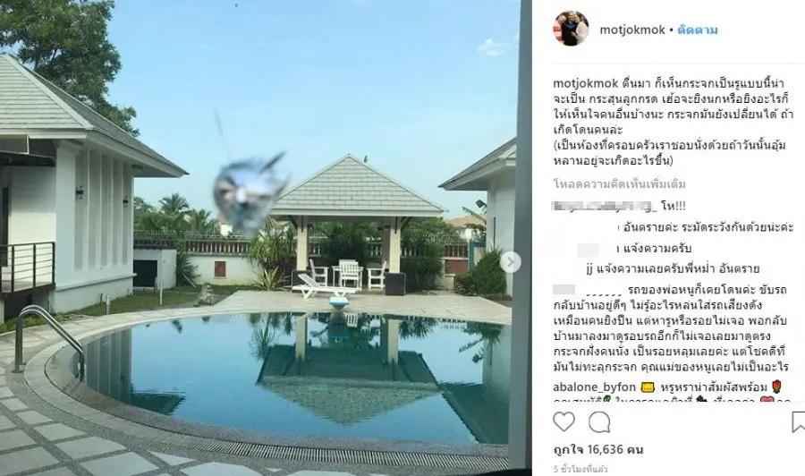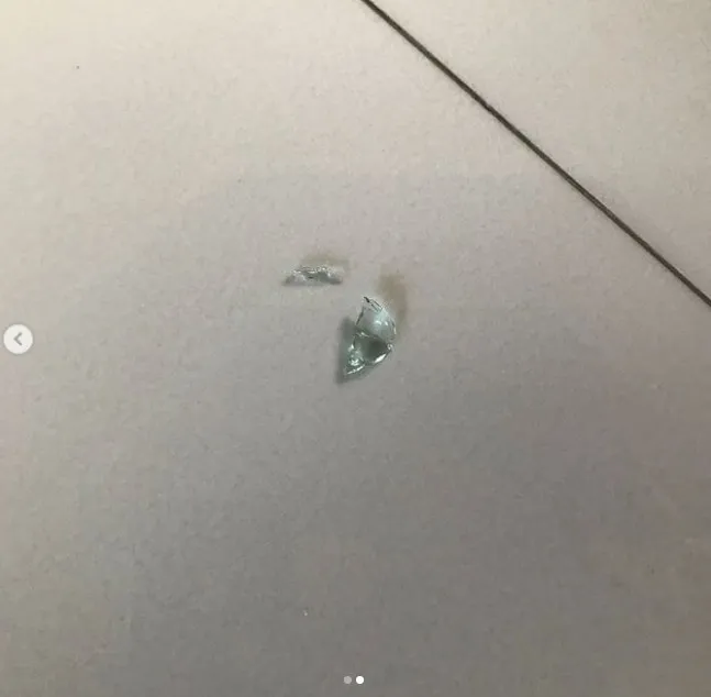 “ตื่นมา ก็เห็นกระจกเป็นรูแบบนี้น่าจะเป็น กระสุนลูกกรด เฮ้อจะยิงนกหรือยิงอะไรก็ให้เห็นใจคนอื่นบ้างนะ กระจกมันยังเปลี่ยนได้ ถ้าเกิดโดนคนล่ะ (เป็นห้องที่ครอบครัวเราชอบนั่งด้วย ถ้าวันนั้นอุ้มหลานอยู่จะเกิดอะไรขึ้น)”
